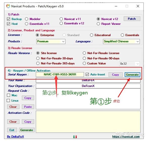 在 4)区块中点击Generate按钮就会生成一个许可证秘钥,将许可证秘钥复制后就打开Navicat Premium 12