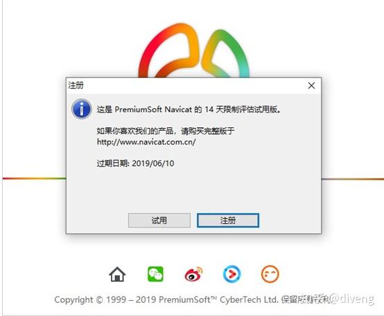 复制keygen之后,打开未激活的navicat,打开软件后会弹出一个提示框,一个是使用14天,一个是注册,这里我们点击注册(如果未激活,但是navicat已经打开运行了,到运行界面了,那么在菜单栏的最后那个“帮助”里,点注册,同样可以出来注册的界面)